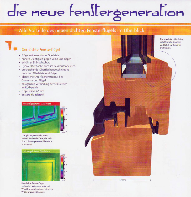 Bei den Holzfenstern produziert die Firma HM Fenster und Türen jetzt den neuen dichten Fensterflügel als erster und bisher einziger deutscher Fensterhersteller.Es wird keine aufgesetzte Glasleiste innen mehr eingebaut, statt dessen gibt es jetzt den Flügel mit angefräster Glasleiste und fest verklebten Scheiben (siehe Detailschnitt links). Eine doppelte Flügeldichtung ergibt eine höhere Dichtigkeit gegen Wind und Regen und eine höhere Wärmedämmung. Damit wurde auch das Holzfenster für das heutige Energiebewustsein fit gemacht. Der dichte Fensterflügel verhindert Wärmeverluste bei Winddruck und anderen widrigen Witterungsverhältnissen. Dieses Fenster entspricht den heutigen Anforderungen des Blower Door Testes, bei dem bisher jedes Holzfenster mit Glasleiste durchgefallen ist.