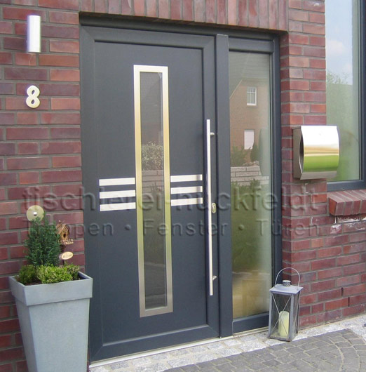 Füllungshaustür mit festem Seitenteilalles in anthrazitgrau, Füllung mit einer schmalen Scheibe und Edelstahl-Applikationen